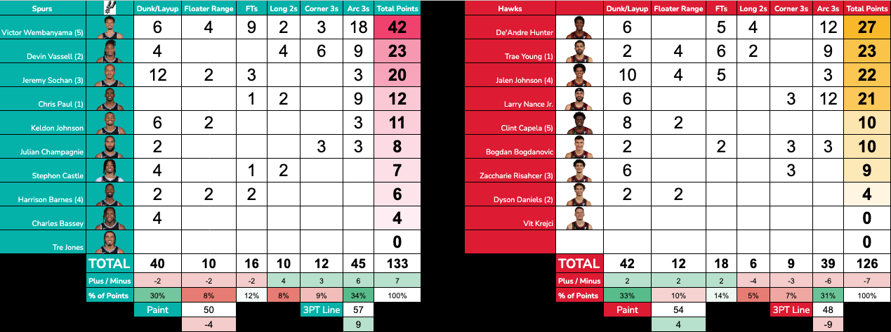 Wemby also finished with 10 paint points in the win. He got to the paint a few times on drives, dives out of the pick-and-roll, and in the fourth, he was able to post several Hawks defenders near the center of the free throw line and finish paint looks over them. He had an epic play in the fourth, when it looked like he had nowhere to go on a possession. What did he do? He threw the ball at the side of the backboard, caught it in mid-air and he had a putback dunk.